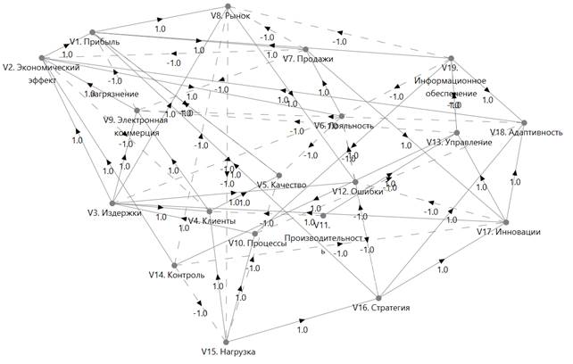 Рис. 1. Когнитивная карта взаимосвязей ключевых параметров конкурентоспособности предприятий общественного питания в условиях цифровизации (составлено автором в среде [9])