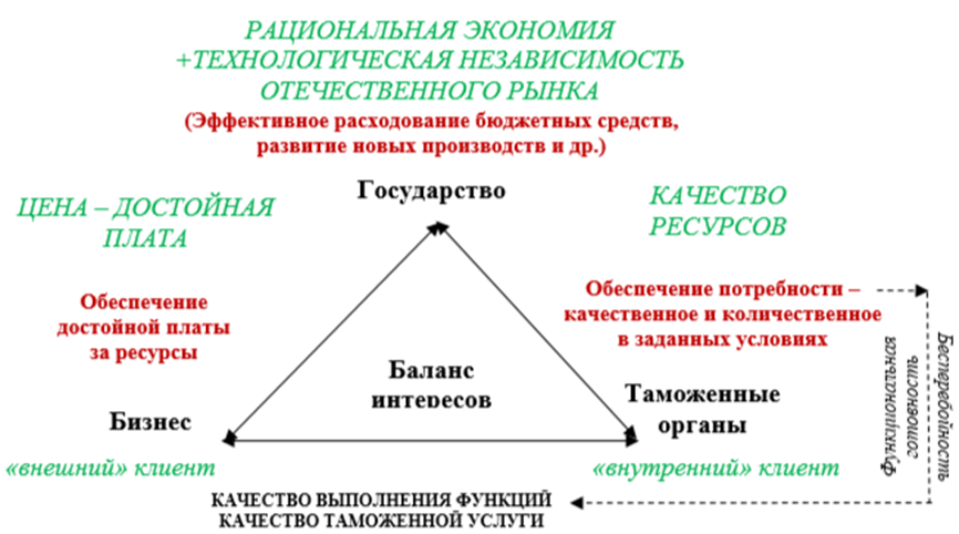 Основная цель тылового обеспечения деятельности таможенных органов – удовлетворение их потребности в ресурсах. Данный механизм находится в зависимости от эффективности использования ресурсного потенциала таможенных органов (ресурсов и управления возможностями улучшения текущего состояния работы процессов механизма). Вместе с тем оказывается влияние и на ресурсный потенциал представителей бизнеса и государства (в рамках закупочной деятельности). Наглядно это можно представить в виде пирамиды интересов закупочной деятельности таможенных органов (с позиции клиентоориентированного ресурсообеспечения) (рис. 2).