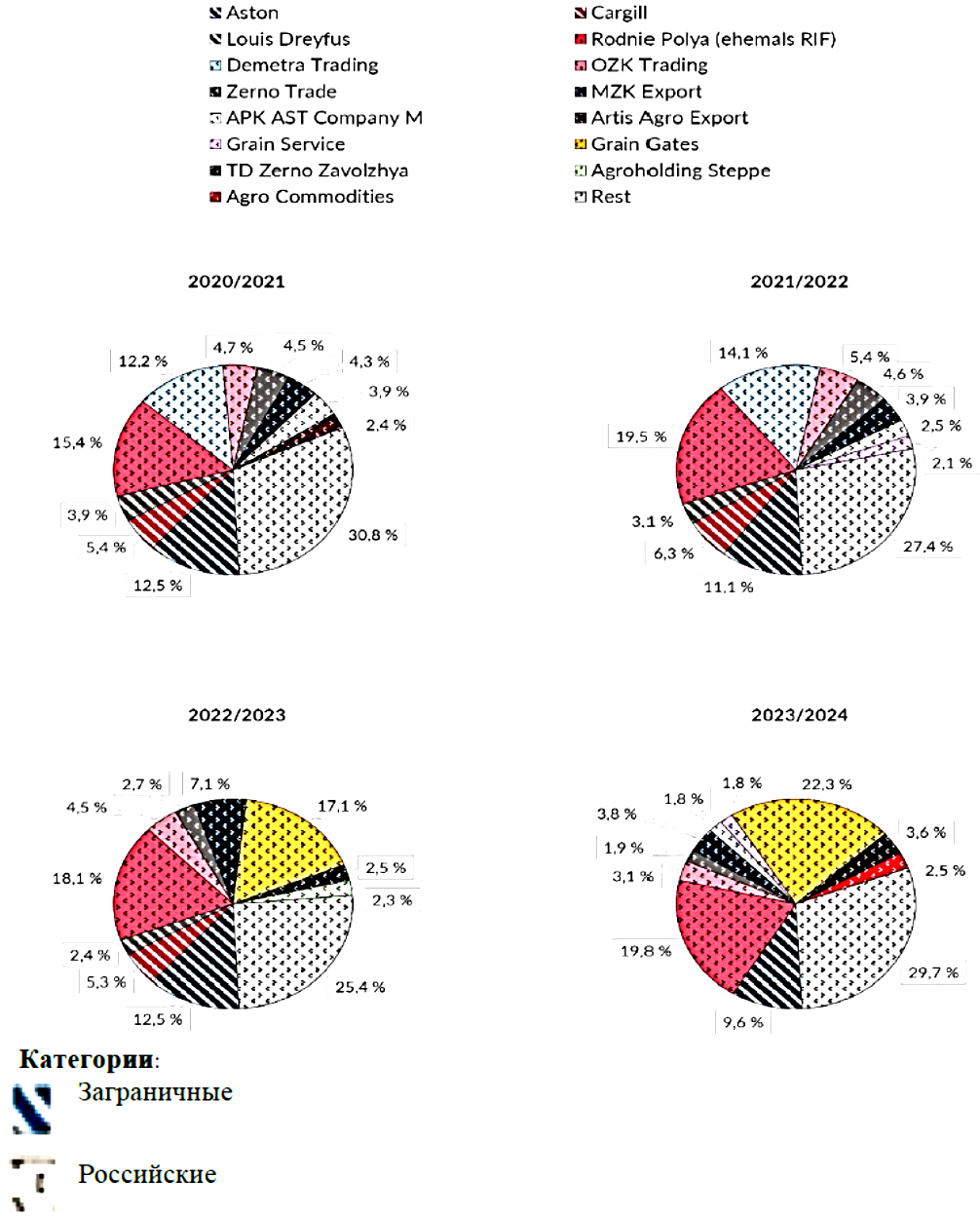 Лидирующую роль в экспорте пшеницы в первой половине 2023–2024 года, а именно 90% от общего объема, обеспечили 50 крупнейших экспортеров. Среди них лишь две компании, швейцарские зернотрейдеры «Aston» и «Sierentz Global Merchants», имели иностранное происхождение, остальные представляли российские организации. «Aston» уверенно сохранила свои позиции в тройке лидеров, экспортировав 2,3 млн тонн за указанный период. В то же время, 17 мая 2024 года «Sierentz Global Merchants» приняла решение о ликвидации своей российской «дочки» [3].