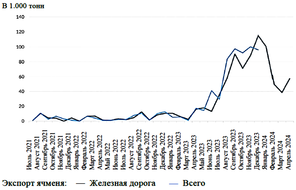 Анализ динамики экспортных поставок российской пшеницы и ячменя в 2020 – апреле 2023 гг. демонстрирует постепенное увеличение оборота зерна, который, начиная с мая 2023 г. по январь 2024 г. резко усилился, демонстрируя заинтересованной китайской стороны в российском зерне, что позволило нарастить выручку в российский бюджет (Рисунок 6.1 и 6.2), с учетом потери рынков сбыта в Европе, продиктованное политикой Евросоюза усиливать санкционное давление для ослабления экономики Российской Федерации.