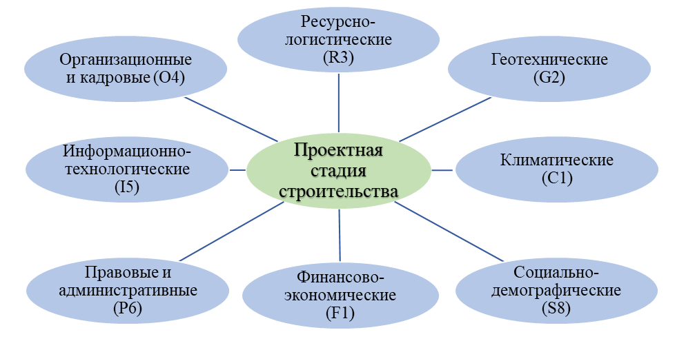 На первом этапе исследования выполнена идентификация и структурирование совокупности факторов риска, оказывающих влияние на организационно-технологические процессы строительного производства. На основе анализа нормативных документов, проектных материалов и экспертных оценок сформирована классификация, включающая восемь укрупнённых групп факторов (рис. 1).