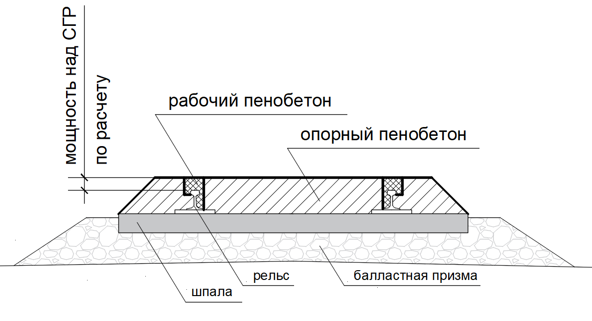 Рабочая высота возвышения покрытия из пенобетона над головкой рельса также должна быть рассчитана по специально созданной для этого методике. Конструктивное решение рабочей зоны покрытия (зоны непосредственного взаимодействия колёс подвижного состава с рельсами) должно обеспечивать как возможность быстрого восстановления покрытия при его нарушении колёсами подвижного состава, так и возможность выполнения диагностики и мониторинга рельсовой колеи (в коротких разрывах для локальных точек).
