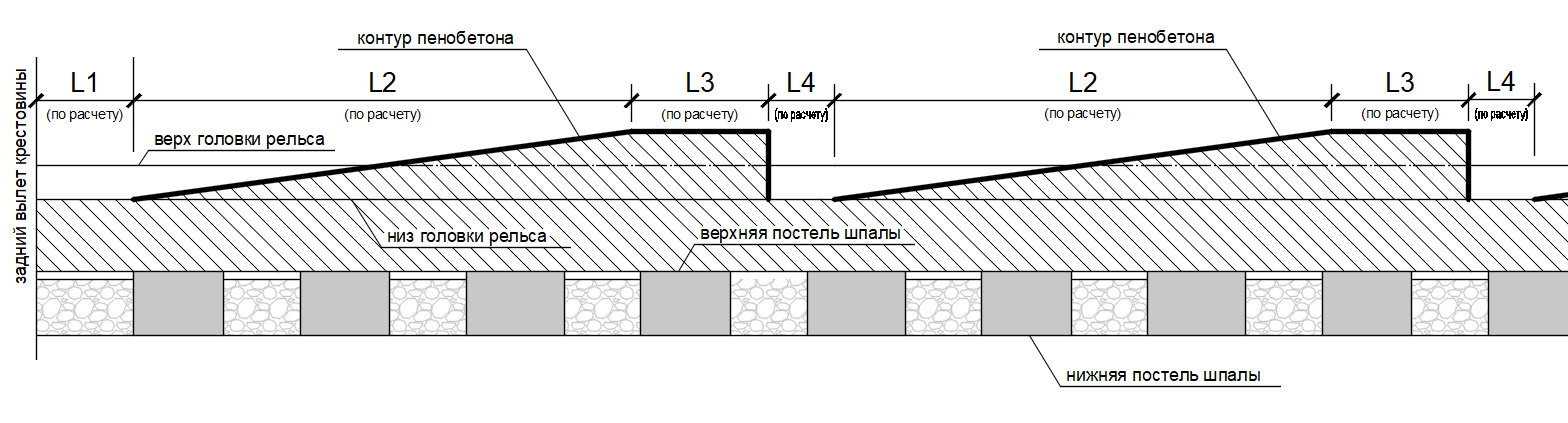 L1 — расстояние от заднего стыка крестовины стрелочного перевода до начала укладки пенобетона;