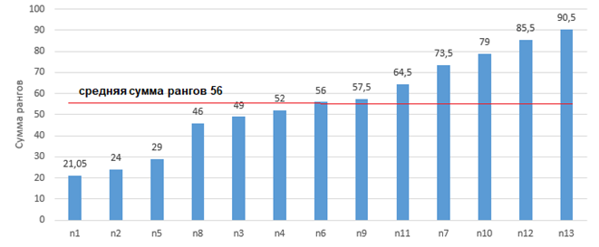 Т.к. = 21,026 , то верно неравенство , что подтверждает гипотезу о неслучайности экспертного согласия. Таким образом полученные результаты могут использоваться в исследовании. На рисунке 1 представлена априорная диаграмма рангов, полученная по результатам экспертного опроса.