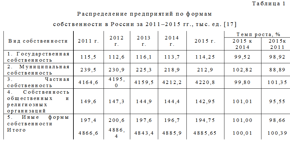 Считаем, что окончательному становлению частной собственности способствовало проведение массовой приватизации государственного имущества. В результате возможности приобретать и продавать имущество повысилась мобильность населения, и всего за несколько лет частная собственность стала преимущественной формой в экономических отношениях. Данная тенденция сохраняется и в последние годы (табл. 1).
