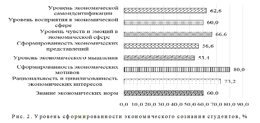Формировать экономическое сознание, адекватное экономическое мировоззрение, рачительное отношение к ресурсам целесообразно с раннего детства, уделяя особое внимание этому процессу в период обучения в школе и в высшем учебном заведении. Нами была проведена диагностика сформированности экономического сознания у студентов гуманитарных специальностей Волгоградского государственного технического университета (группы М-1-13, М-2-13, Э-1-13, Э-2-13, М-1-14, Э-1-14, Э-2-14). В результате было установлено, что экономическое сознание студентов сформировано в среднем на 64% (рис. 2).