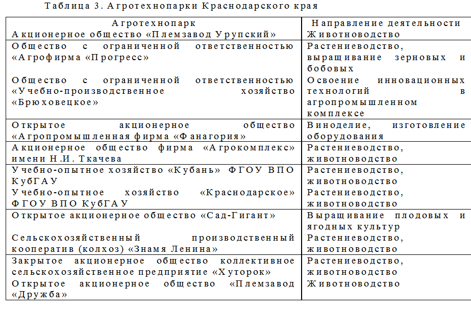 •организация семинаров,  конференций, «круглых столов», выставок  по вопросам развития инновационной деятельности, мероприятий  по подготовке и повышению квалификации кадров для субъектов инновационной деятельности. В Краснодарском крае созданы агротехнопарки – это новая форма интеграции аг-рарной науки, образования и агропромышленного  производства  в  целях создания, внедрения и доведения продукта сельскохозяйственной инновационной деятельности до рынка путем его коммерциализации.
