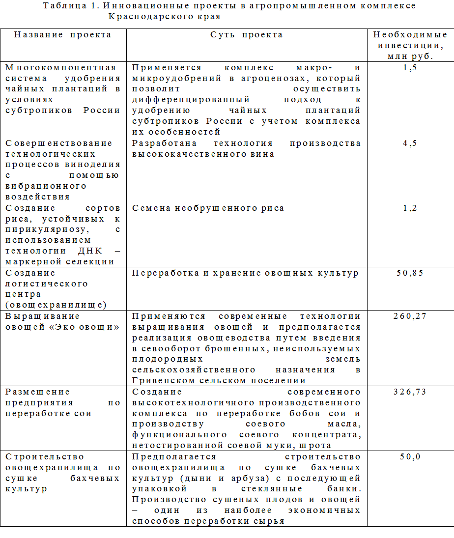 Результаты научных разработок через систему информационно-консультационной службы, публикацию методических рекомендаций и проведение конференций и семинаров-совещаний  внедряются в сельскохозяйственное производство края, способствуя инновационному развитию агропромышленного комплекса Краснодарского края. Так,  в 2016 г. из средств краевого бюджета было выделено 28 млн руб. для финансирования научных конкурсов, общая сумма составила 56 млн руб. На инвестиционном портале Краснодарского края представлены более 30 инновационных проектов агропромышленного комплекса, для реализации которых необходимы инвестиции (табл. 1).