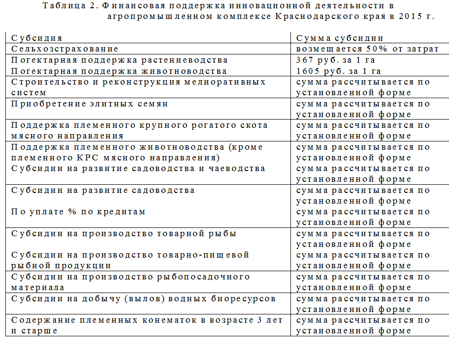 Государственная поддержка инноваций аграрного сектора в Краснодарском крае недостаточна, в основном это предоставление различных субсидий, которые в целом не могут способствовать активному продвижению инновационной деятельности в аграрном секторе края. Данная ситуация характерна не только для Краснодарского края, но в целом для страны. Так, на реализацию перспективных инновационных проектов в агропромышленном комплексе из федерального бюджета в 2015 г. было направлено 70 млн руб. вместо запланированных 1,244 млрд руб., что сдерживает развитие инновационных технологий в аграрном секторе. В табл. 2 приставлены основные субсидии, выделяемые аграриям Краснодарского края для поддержки, в том числе инновационной деятельности.