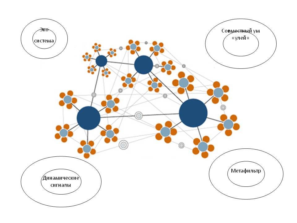 Социальное предприятие – совокупность взаимодействующих элементов, которые формируют экосистему, работающую слаженно и эффективно (см. рис. 3). Такое предприятие ориентируется на сотрудничество в рамках выполнения текущей и перспективной работы, интенсифицируя контакты внутри системы и системы с внешней средой. При этом формируется совместное сознание, которое ассоциируется с поведением пчел в улье – совместная однонаправленная работа позволяет повысить эффективность системы. Но используется и обратная связь с клиентами, не только в виде классических форм – опросов, книг жалоб и т.п., но и социальных сетей (динамические сигналы). С социальный бизнес должен иметь механизмы восприятия этих социальных сигналов, обработать поступившую информацию и дать импульс необходимому социальному действию (метафильтр). В процессе использования данной модели констатируется важность образования (самообразования), организационной культуры, сотрудничества, содержания работ.