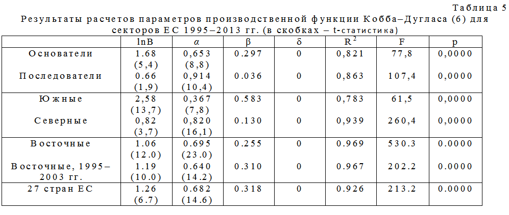 Производились расчеты функций Кобба–Дугласа для полного периода и без учета последних лет, связанных с кризисом 2008–2009 гг. (табл. 5). Статистические характеристики во втором случае заметно улучшались. Надо отметить, что страны Восточной Европы имеют эластичность по фондам, близкую к странам-основателям, эффективность вложений в их экономику заметно выше, чем у южных стран, хотя и уступает другим секторам.