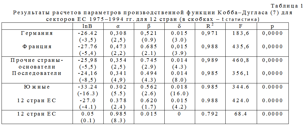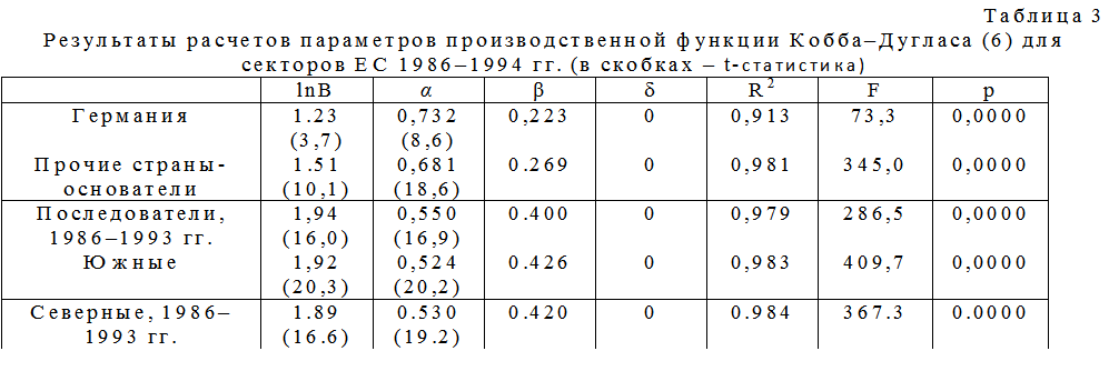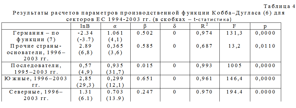 За 1986–2003 гг. расчеты по функции (8) показали, что эффективность вложений в данном периоде растет во всех секторах. Для северных стран не удалось найти приемлемое решение для всего периода по формуле (7), эластичность по фондам примерно равна 1 и соответственно эластичность по труду становится небольшой и отрицательной. Расчеты по формулам (8) и (9) также показали для северных регионов рост эластичности по фондам. Наиболее эффективными оказались страны-последователи и страны-основатели без Германии, эффективность которой снизилась и была лишь немного больше, чем южных стран.
