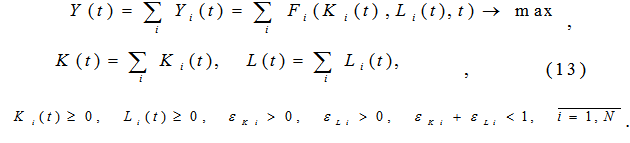 Для производственных функций (7) оптимальное распределение находится последовательным решением нескольких нелинейных уравнений стандартными методами. Если принять, что функции имеют одинаковую степень однородности, то система преобразуется в нелинейное уравнение относительно соотношения показателей. Модель (13) может рассматриваться при различных ограничениях на ресурсы, например при условии, что структура занятости не меняется, а перераспределяться могут только инвестиции. В данном случае фактически проверяется, насколько оптимально распределены инвестиции между секторами, ответ на этот вопрос дает динамика разницы объемов производства при реальном и оптимальном распределении инвестиций.