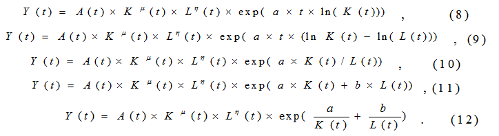Низкая значимость параметра β для Германии в расчетах по функции (7) привела к необходимости проводить расчеты по другим функциям. Расчеты по функции (8) показали, что эластичность по фондам в Германии была высокой и незначительно выросла, от 0,.93 до 0,94 при нулевом темпе технического прогресса.
