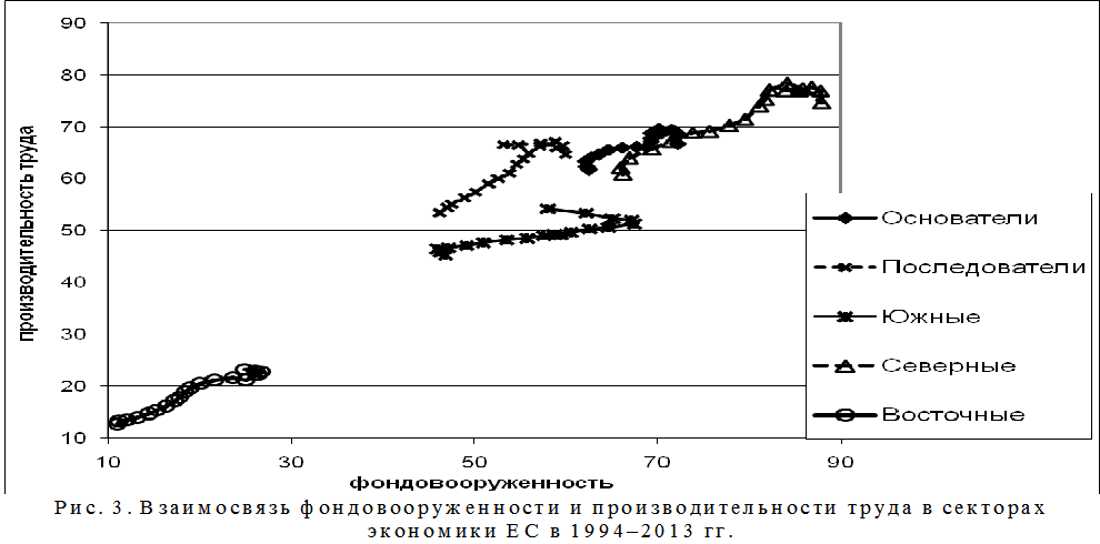 Начало третьего периода было относительно спокойным, хотя часть стран затронула рецессия 1995 г. и азиатский кризис 1997–1998 гг. Но почти все страны ЕС тяжело пережили кризис 2008–2009 гг., соответственно в этом периоде после кризиса возникла похожая ситуация, как и в первом периоде, но производительность труда не росла при падении фондовооруженности. Также надо отметить, что вступившие в ЕС в XXI в. страны очень сильно уступали по своим показателям членам ЕС, даже южным странам (рис. 3).
