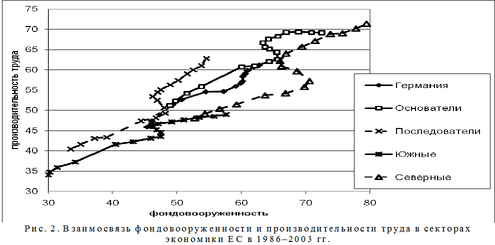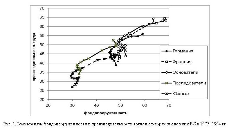 Исследовалась зависимость производительности труда от фондовооруженности по ЕС, отдельным странам и секторам. Расчеты проводились по пространственным и панельным данным. В последнем случае приходилось вводить фиктивные переменные, поскольку по мере расширения ЕС в нее включались все менее эффективные страны.
