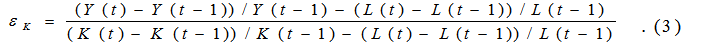 По формуле (1) можно вычислить влияние отдельных секторов на изменение факторной эластичности eK , которое определяется удельным весом сектора по ВВП и изменением секторной факторной эластичности. Для определения факторной эластичности существует два подхода. В первом строились производственные функции, и из них определялась динамика эластичности. Во втором подходе строились приближенные оценки динамики факторной эластичности. Линейно-однородные производственные функции можно записать через логарифмические производные: