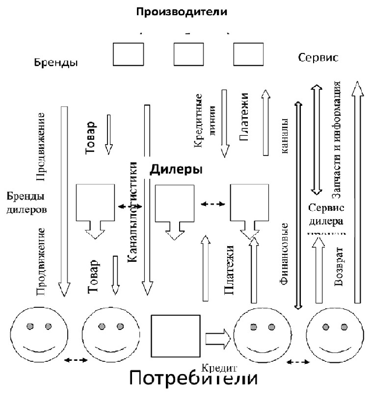 Дилерские структуры требуют наличия жёсткого иерархического стержня, вокруг которого выстраивается система товародвижения, финансирования закупок, рекламных кампаний, сервисного обслуживания. Дилерская сеть – это объединение компаний в рамках единой организационной структуры, функционирующей в соответствии с определенным набором норм и правил, связанных между собой общими финансовыми, информационными, товарными потоками, торговыми марками и сервисами [1]. Её схема представлена на рис. 1: она состоит из управляющего центра, функции которого может выполнять производитель или уполномоченный им дистрибутор (если у производителя недостаточно возможностей для осуществления этих функций), дилеров и потребителей, связанных между собой различными каналами. Рассмотрим их подробнее.
