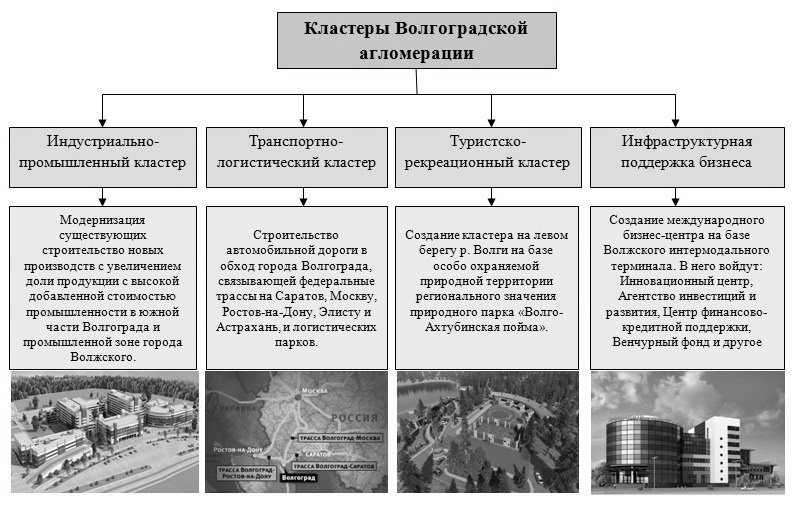 1. Индустриально-промышленный кластер — предполагает модернизацию существующих производств и возведение нового. Строительство кластера предложено выполнить в южной части г. Волгоград, а также промышленной зоне г. Волжский. Предлагается создать промышленный кластера на основе существующего предприятия ОАО «Волжский трубный завод». Данное предприятие специализируется на производстве бесшовных труб, активное продукция завода используется в нефтегазовой, нефтехимической, автомобильной промышленности.