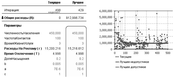Решить задачу (2) - (3) для фиксированных значений набора параметров модели (рис. 2, табл. 1) можно с помощью такого средства AnyLogic, как «Оптимизационный эксперимент». Для значений параметров, приведенных в табл. 1 и в тексте выше, результаты оптимизации представлены на рис. 4. В эксперименте выполнено 500 прогонов СД-модели. Параметры варьировались случайным образом в соответствии с равномерным распределением в прямоугольнике: