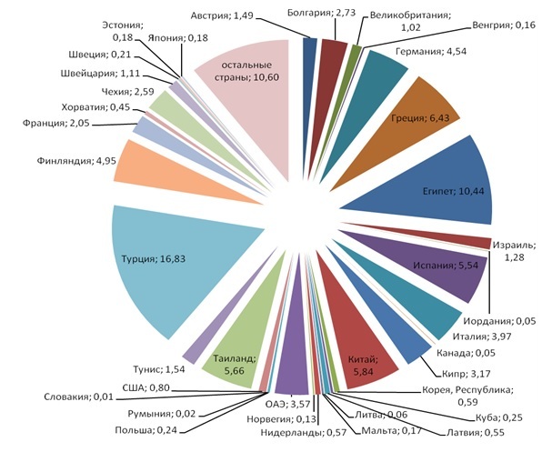 По данным Федерального агентства по туризму Министерства культуры РФ, странами - лидерами по числу российских туристов (рис. 1) являются Турция, Египет и Греция (по состоянию на 2013 г.) [10].