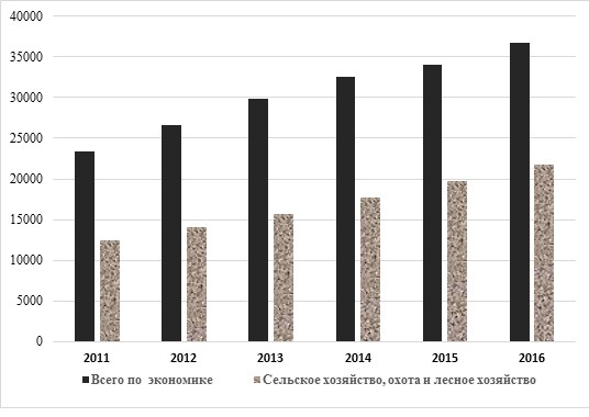 Однако, по данным Федеральной службы государственной статистики, среднемесячная заработная плата работников за 2011-2016 гг. в сельском хозяйстве значительно отстает от уровня заработной платы по экономике в целом (рисунок 2).[6]