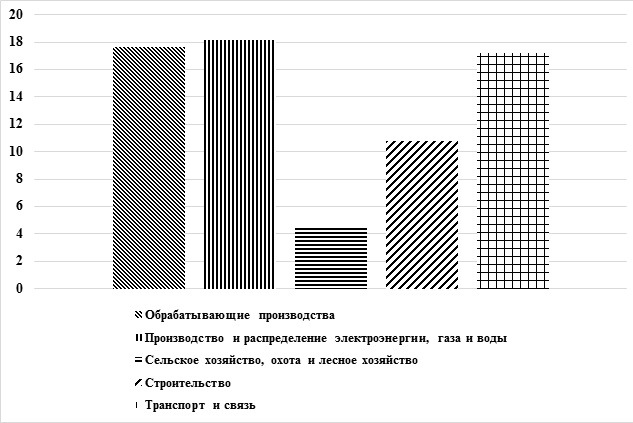 Рассматривая образовательную составляющую человеческого капитала, следует отметить, что уровень образования жителей Пензенской области относительно низкий. Только шестнадцать процентов населения старше восемнадцати лет имеют высшее образование, тогда как в целом по России данный показатель равен девятнадцати процентам. Среди сельских жителей Пензенской области высшим образованием обладают только семь процентов. При этом по статистическим данным за 2014 год, лишь 4,5 % работников сельского хозяйства прошли обучение по дополнительным профессиональным программам и образовательным программам [5]. Это в несколько раз ниже, чем, например, в строительстве, транспорте, обрабатывающих производствах и т.д. (рисунок 4).
