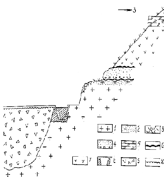 Рис. 3. Схема строения западного борта Эшкаконского водохранилища: 1-3 – палеозойские граниты: 1 – массивные, 2 – трещиноватые (зона современного физического выветривания), 3 – каолинизированные (кора предъюрского химического выветривания); 4 – песчаники хумаринской свиты (нижний отдел юрской системы, плинсбахский ярус)); 5 – известняки и доломиты (верхний отдел юрской системы, оксфордский и кимериджский ярусы); 6 – границы крупных стратиграфических и угловых несогласий; 7 – задернованный склон с горно-луговой растительностью; 8 – бетонные сооружения; 9 – насыпная плотина; 10 – максимальный уровень водохранилища (