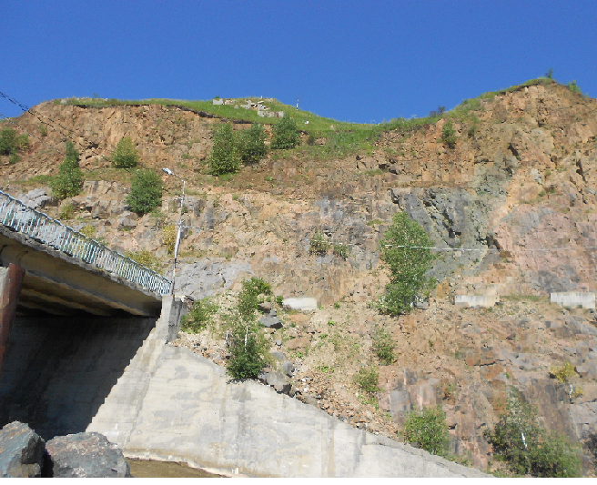 Гидрологам и гидрогеологам важно знать, насколько глубоко от дневной поверхности проникает зона современного выветривания (гипергенеза), в которой тектонические трещины становятся водопроницаемыми. С этой точки зрения представляет интерес дорожная выемка в гранитах, выполненная при строительстве плотины взрывным способом. На левом склоне долины вдоль дороги на протяжении