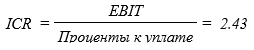 Для оценки долговой нагрузки на организацию, инвесторы, помимо коэффициента автономии, рассчитывают коэффициент покрытия процентов к уплате. Коэффициент покрытия процентов к уплате (ICR) показывает, во сколько раз прибыль до вычета процентов и налогов превосходит проценты, уплачиваемые по заемным средствам.