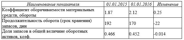Коэффициент оборачиваемости материальных средств показывает число оборотов запасов и затрат за анализируемый период, либо число оборотов основных составляющих запасов и затрат. Себестоимость проданной продукции, приходящаяся на 1 рубль материальных запасов возросла на 0.25 руб. и составила 2.12. При этом аналогичный показатель, но по отношению к стоимости сырья и материалов, готовой продукции и товаров для перепродажи не изменился. Срок хранения запасов снизился на 22 дн.
