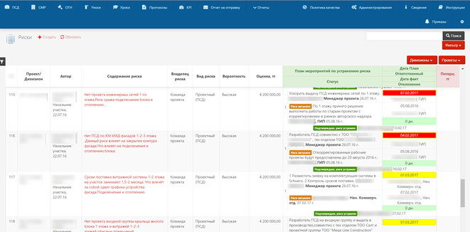 Так любой член команды может занести в систему идентифицированный риск. Определить владельца риска, его вид, который предлагает система из справочника, оценить его вероятность и предварительную стоимостную оценку риска. Тут же через корпоративную почту поступит сообщение о созданном риске всем заинтересованным лицам. В том числе и руководителю проекта, который тут же заходит в этот реестр и назначает мероприятия по реагированию на риск. Система на основе алгоритма отслеживания поручений сгенерирует сообщения ответственным и напомнит о необходимости выполнения соответствующих задач.