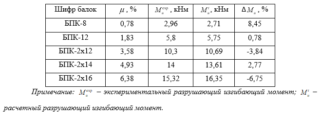 Из таблицы 1 видно, что “стандартная” методика расчета прочности нормальных сечений балок (согласно СП 63.13330.2012), обеспечивает достаточную сходимость результатов расчета с экспериментальными значениями.