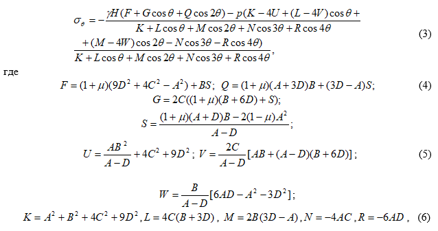 В работе [10] была приведена формула тангенциального нормального напряжения, использованная автором для определения при заданных напряжениях на контурах выработок, возникающих от действия собственного веса пород, форм поперечных сечений подземных и открытых выработок, построенных при помощи отображающей функции (1), в зависимости от коэффициента бокового распора ненарушенного однородного, линейно деформируемого горного массива. Вывод этой формулы приведен в монографии [12], а в статье [13] она была использована для решения задачи о глубине заложения подземной горизонтальной выработки.