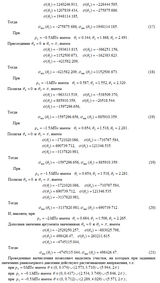 Опираясь на результаты работы [12], и значения (16) – (21), исследуем прочность рассматриваемой выработки при данных значениях (15) давления. Для этого необходимо выполнение следующих неравенств