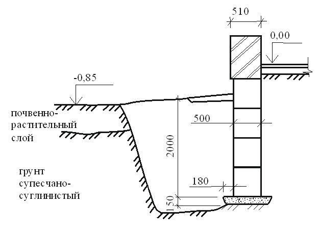 - фундаменты здания выполнены из бетонных стеновых блоков шириной 500 мм с опиранием на щебеночную подготовку толщиной 150 мм. Глубина заложения подошвы фундамента 2,0 м. В основании залегают супесчано-суглинистые грунты. Общее состояние фундаментов удовлетворительное.