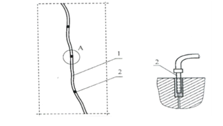 Рис.1. Схема установки инъекторов: 1 – трещина; 2 – инъекторы через 20-30 см.