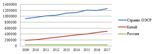 Рис. 1. Динамика внутренних затрат на исследования и разработки по странам ОЭСР за период 2009-2017 гг., млн. долларов США, в текущих ценах