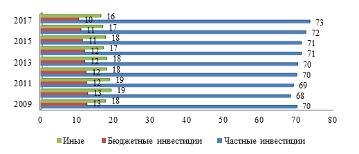 Согласно статистическим данным (рис. 2), наибольший вклад в финансирование исследований и разработок по странам ОЭСР за анализируемый период вносит бизнес – на долю частных инвестиций приходится от 68% (в 2010 г.) до 73% (в 2017 г.). Доля инвестиционных средств из бюджетов постепенно снижается и составляет от 19% (в 2010 г.) до 16% (в 2017 г.) [9].