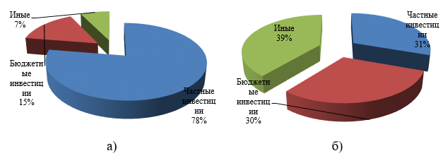 Аналогичная структура инвестиций в инновационный сектор отмечается в Китае (рис 3а), в России данное соотношение свидетельствует о преобладании средств из бюджетов разных уровней в финансировании инновационной сферы (рис. 3б).