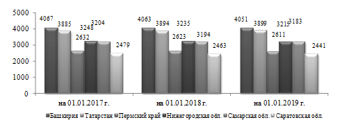 Как видно из рис. 1, в Пермском крае (также как и в Башкирии, Нижегородской области, Самарской и Саратовской областях) ежегодно снижается численность населения и составляет на 1 января 2019 г. 2611 тыс. чел. Рост населения отмечен только в Татарстане.