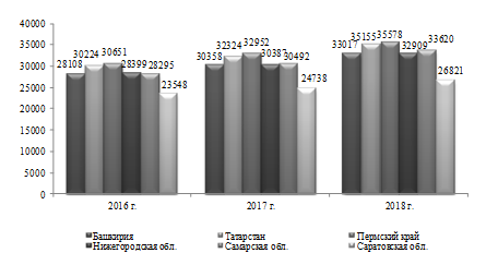 Рис. 2. Динамика среднемесячной номинальной заработной платы в Приволжском федеральном округе за 2016-2018 гг., руб.