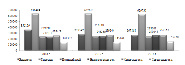 Для понимания развития предпринимательского потенциала округа необходимо рассмотреть основные показатели, характеризующие реализацию предпринимательского потенциала населения Пермского края и наиболее крупных регионов Приволжского федерального округа. Динамику численности населения за 2016-2018 гг. в Приволжском федеральном округе представим на рис. 1.