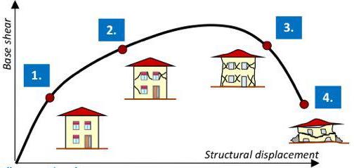 Следующим этапом оценки сейсмостойкости системы является выполнение нелинейного статического расчета при действии модифицированной системы инерционных сил, на основании которого строится кривая несущей способности в координатах «сдвигающая сила в основании – перемещение верха системы».
