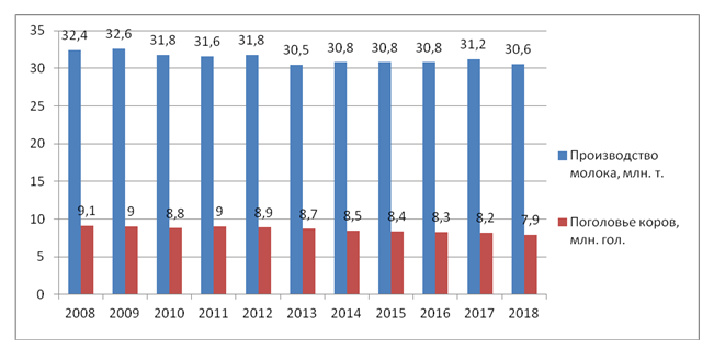 Рис. 3. Производство молока и численность поголовья коров в России (2008 – 2018 гг.)