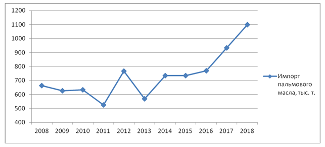 Рис. 4. Динамика импорта пальмового масла в Россию, тыс. т. (2008 – 2018 г.г.)
