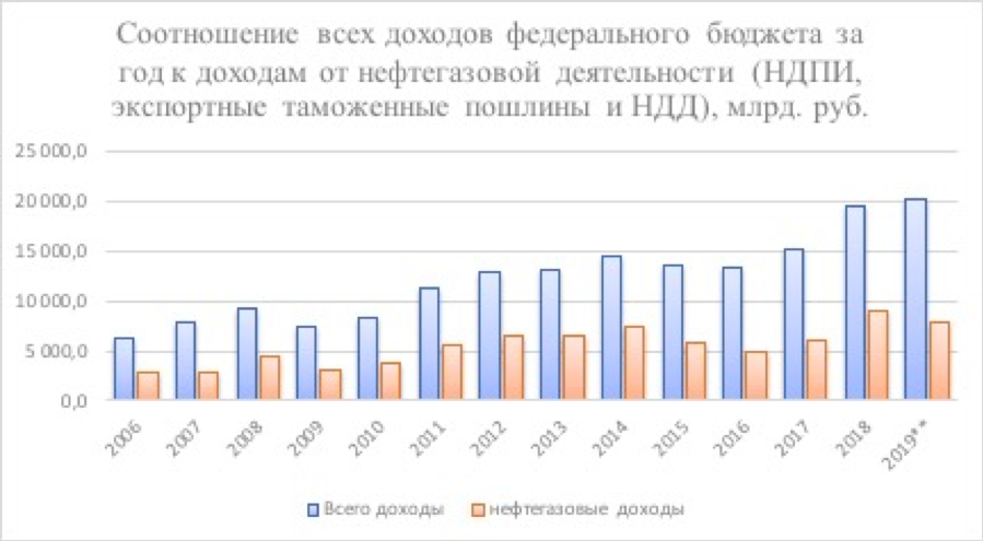 В течение рассматриваемого периода зависимость страны от доходов нефтегазовой отрасли варьировалась от 36% до 51%, а по итогам 2019 года составила 40%. При этом в состав данных доходов входят поступления от налога на добычу полезных ископаемых (НДПИ), экспортные таможенные пошлины, а с 2019 года в состав доходов входит налог на дополнительный доход от добычи углеводородного сырья (НДД). В состав данных доходов не входят налог на прибыль нефтегазовых предприятий и НДС.