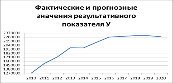 Рис. 1. Фактические и прогнозные значения результативного показателя Y – поступления в бюджет Пенсионного фонда РФ, млн. руб.