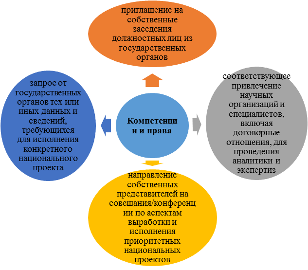 Приведенный и обусловленный выше орган, в сущности, осуществляет функционал по координации, информационному обеспечению и аналитике в отношении исполнения проектов в области науки и образования. Он обладает следующими весомыми компетенциями и правами, приведенными на рисунке 1.