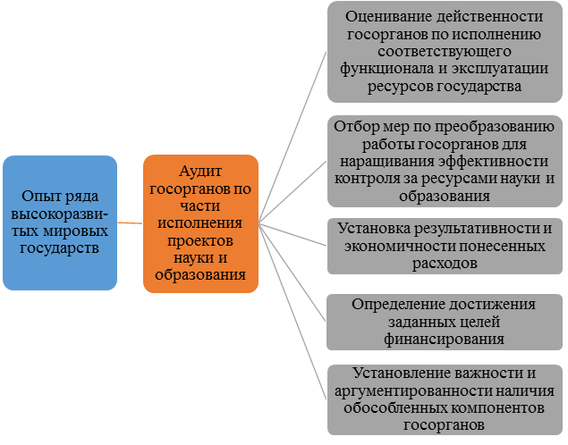 Ввиду сказанного в текущей регламентирующей базе необходимо закрепить терминологию аудита результативности функционирования госорганов, базируясь на опыте высокоразвитых мировых государств, в большей степени в отношении контроля процессов проведения приоритетных научно-образовательных проектов (рисунок 2).